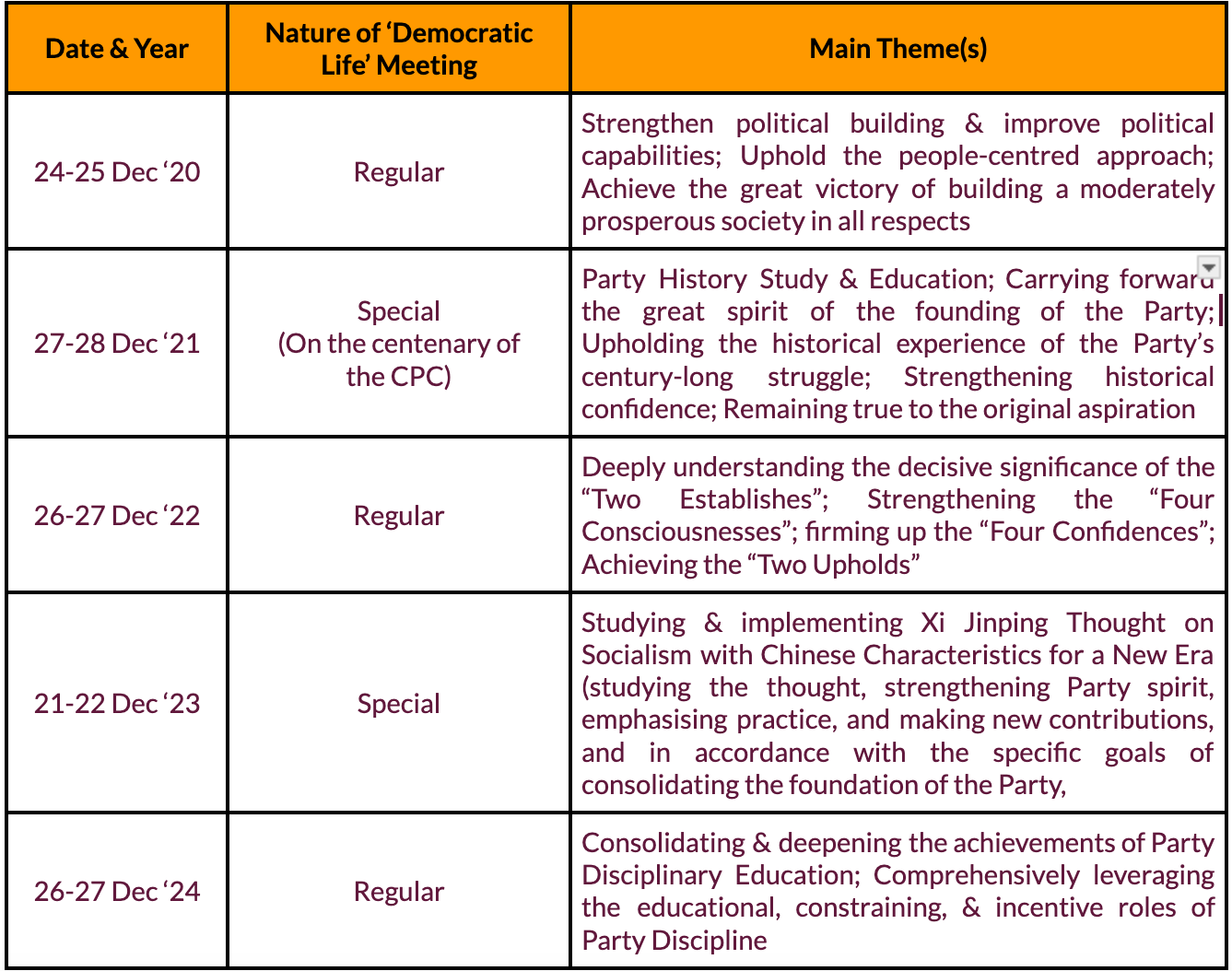 At the 2025 meeting in particular, there was no specific theme. There have been “special” thematic democratic life meetings in the past – for example, in 2021 and 2023, when the respective themes/ topics of focus were ‘Party History Study and Education’, and ‘Implementing Xi Jinping Thought on Socialism with Chinese Characteristics’.[I have prepared an ‘FYI’ table below to picture the central themes of the ‘Democratic Life’ meetings in the past 5 years, their dates, and any key conclusions].