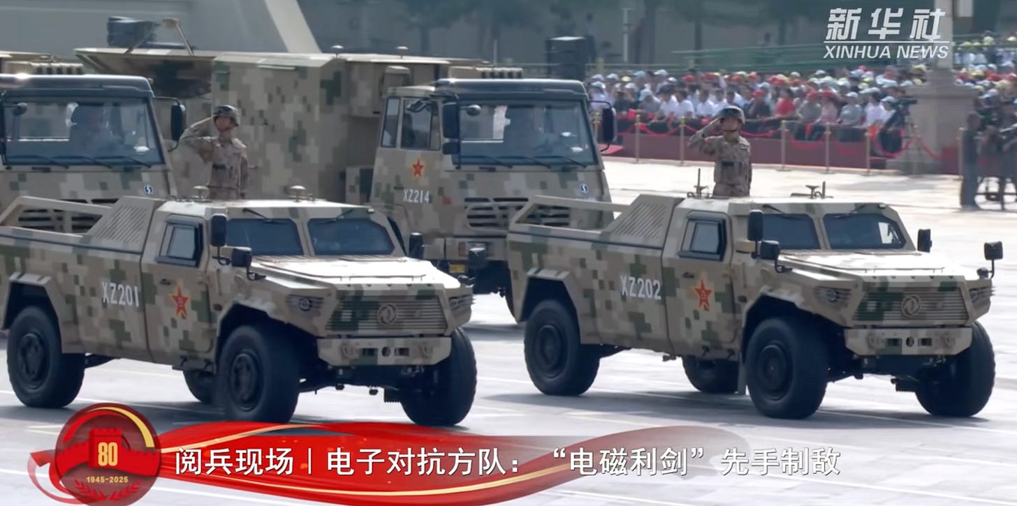 A still from Xinhuanet’s video coverage of CSF, ISF, and Electronic Warfare Formation. | Source Electronic Warfare Formation. An electronic warfare formation passed through Tiananmen Square, and the 5 core pieces of electronic warfare equipment reviewed are reportedly capable of all-frequency reconnaissance, control and precision suppression. They can also defend against aerospace threats and disrupt networks and communications.